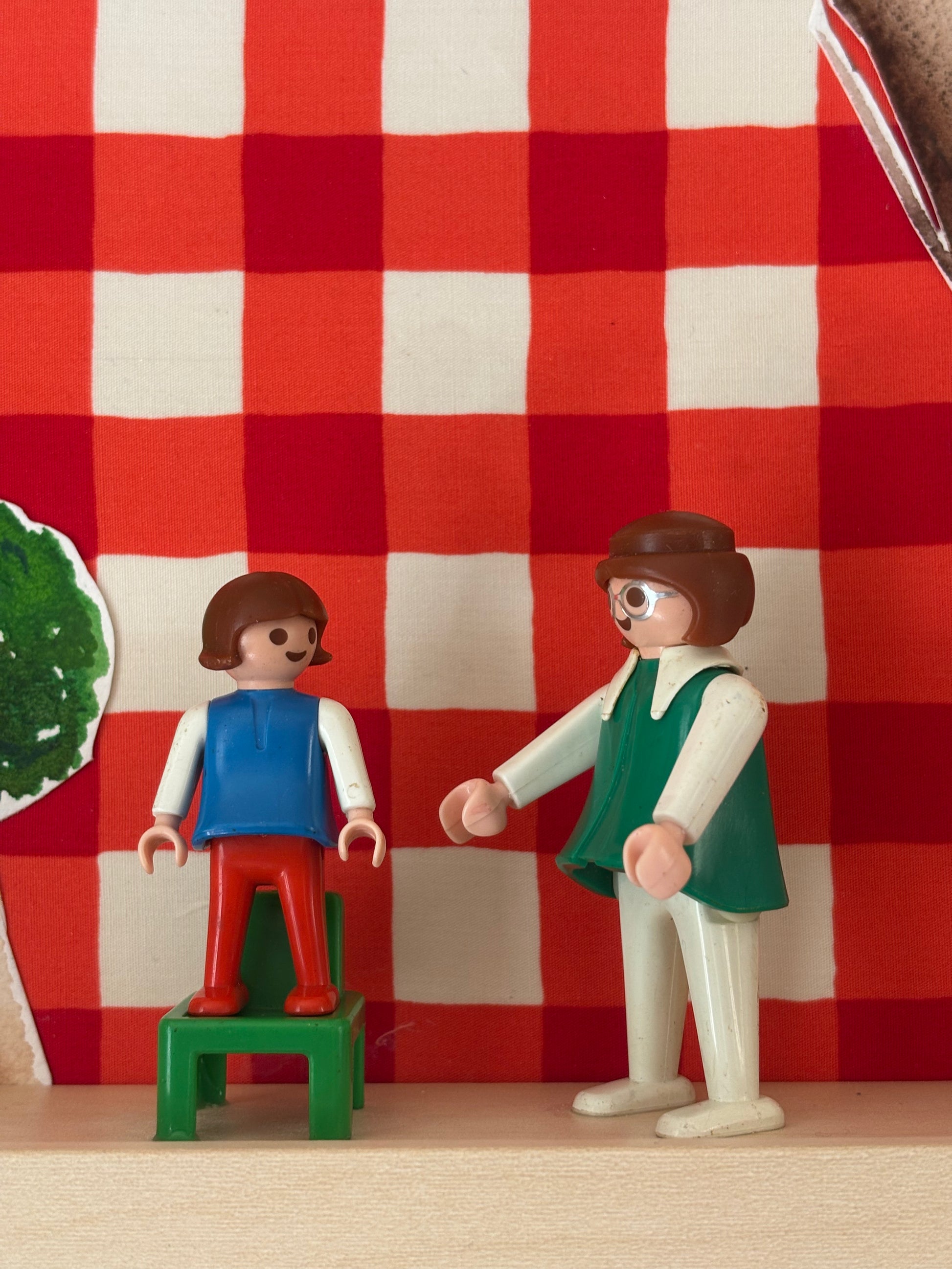 Nota PLAFF: Questo quadretto parla particolarmente ai genitori che giocavano con i Playmobil - vedere i propri giochi d'infanzia diventare arte per i propri figli crea un ponte emotivo unico tra generazioni.
